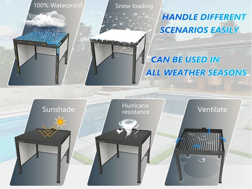 Conçue pour durer, cette pergola repose sur une structure robuste en aluminium 6063-T5 avec revêtement thermolaqué pour une excellente tenue face aux intempéries et à la corrosion. Elle est capable de supporter une charge neige jusqu’à 80 kg/m² et une résistance au vent jusqu’à 120 km/h, tout en conservant son esthétisme et sa rigidité au fil des années.
