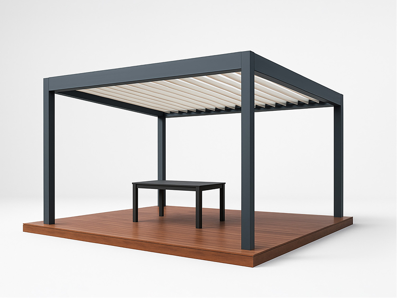 Pergola bioclimatique à lames orientables 180°. Structure aluminium extrudé 6060-T5, fabrication française avec garantie 20 ans.